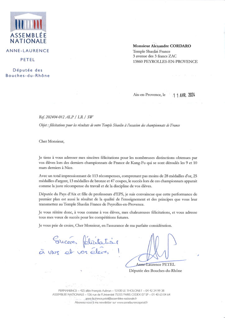 Le Temple Shaolin France est fier et honoré d’avoir reçu une lettre de félicitations de la part de Mme Anne-Laurence Petel, députée des Bouches-du-Rhône, suite aux résultats exceptionnels obtenus par nos élèves lors des derniers championnats de France de Kung-Fu à Nice.